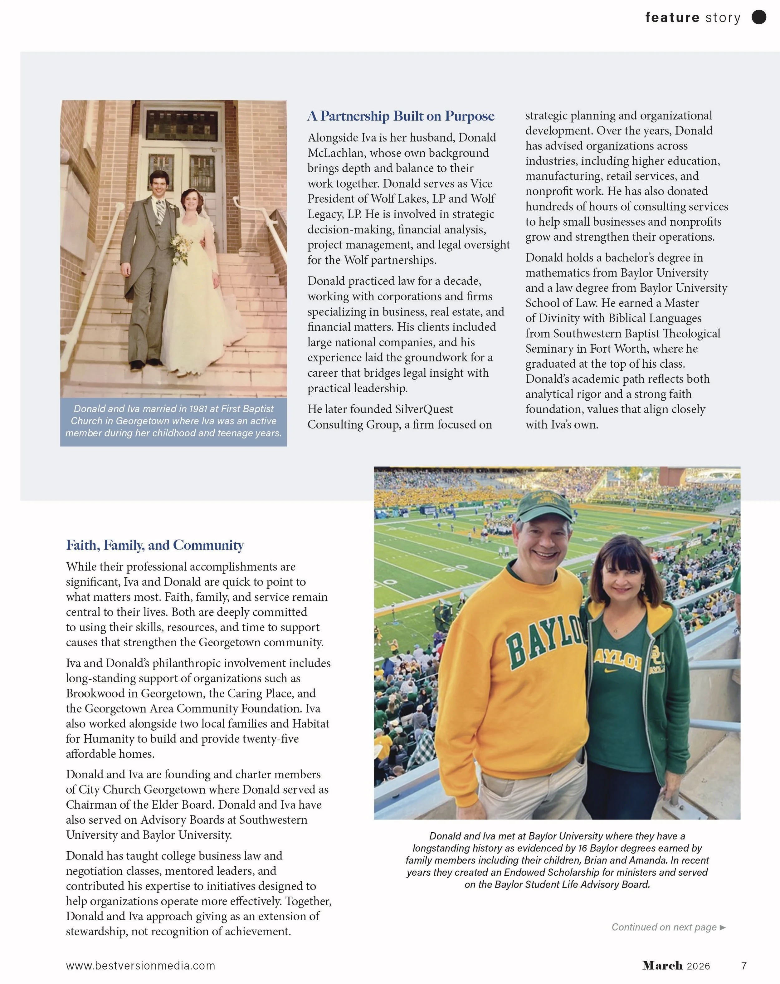 Iva’s local philanthropic endeavors include involvement with Brookwood in Georgetown (BiG), a vocational community for adults with functional disabilities, the Caring Place, and the Chisholm Trail Communities Foundation, which meets a variety of needs in the Georgetown community. Iva also worked with the Chapman, Patience and Wolf families to donate the Oil Mill property to Habitat for Humanity—which provided land for twenty-five new homes.