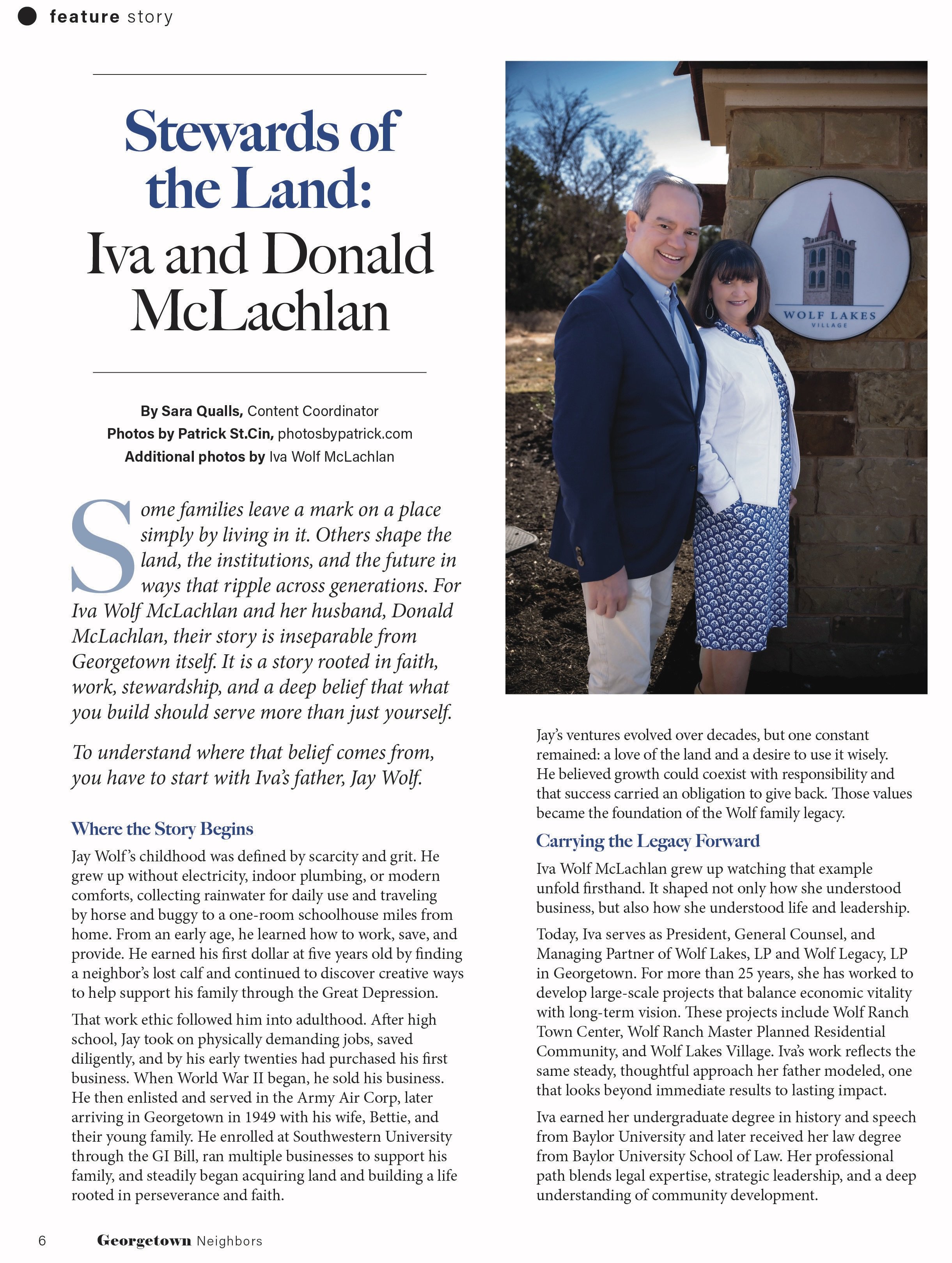 Iva Wolf McLachlan is the President, General Counsel and Managing Partner of Wolf Lakes, LP and Wolf Legacy, LP in Georgetown, Texas. For 25 years Iva has worked to develop three of the largest, most economically beneficial real estate developments in Georgetown, Texas.